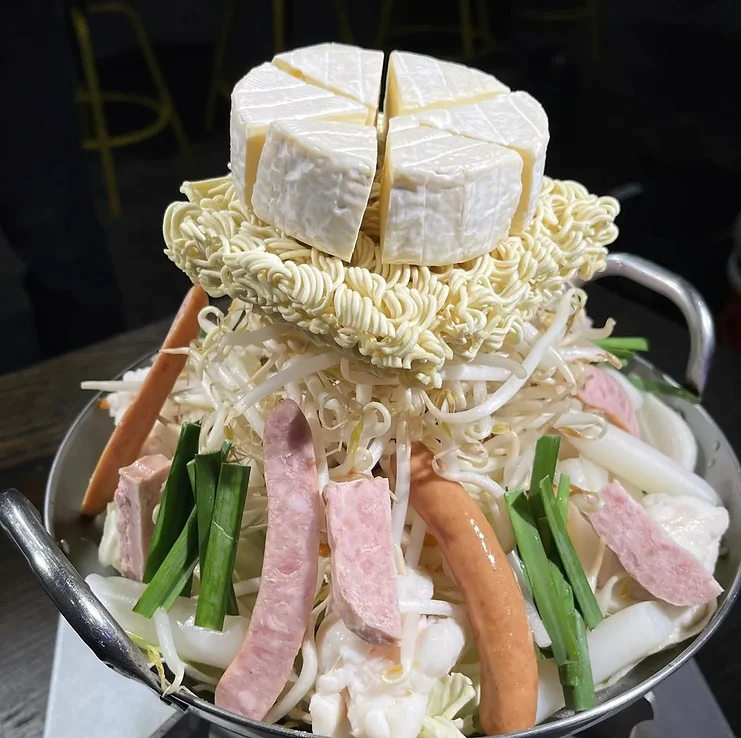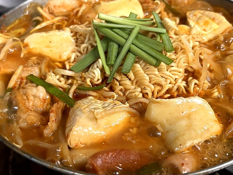 季節を問わず人気のピリ辛鍋のプデチゲです。たっぷりの野菜に、ホルモン、スパムハム、トッポギ、ソーセージ、インスタントラーメンに丸ごとカマンベールチーズをのせた迫力満点!辛さも5段階から選べ、辛いのが苦手な方も、得意な方も満足いただける韓国の大衆鍋です。※ご注文は二人前より承ります。
