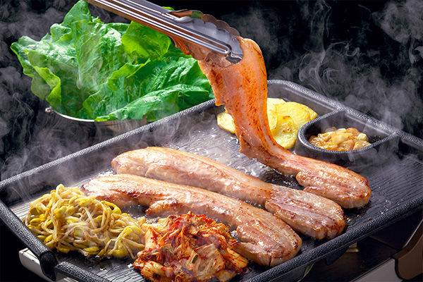 全国より厳選した黒豚の三枚バラを使用したサムギョプサルです。専用の鉄板で焼いたお肉は余分な脂が流れ落ち、お肉と脂の甘味が丁度よい比率になります。お好きなおかずや野菜と一緒に巻き巻きしてお召し上がりください。※ご注文は二人前より承ります。